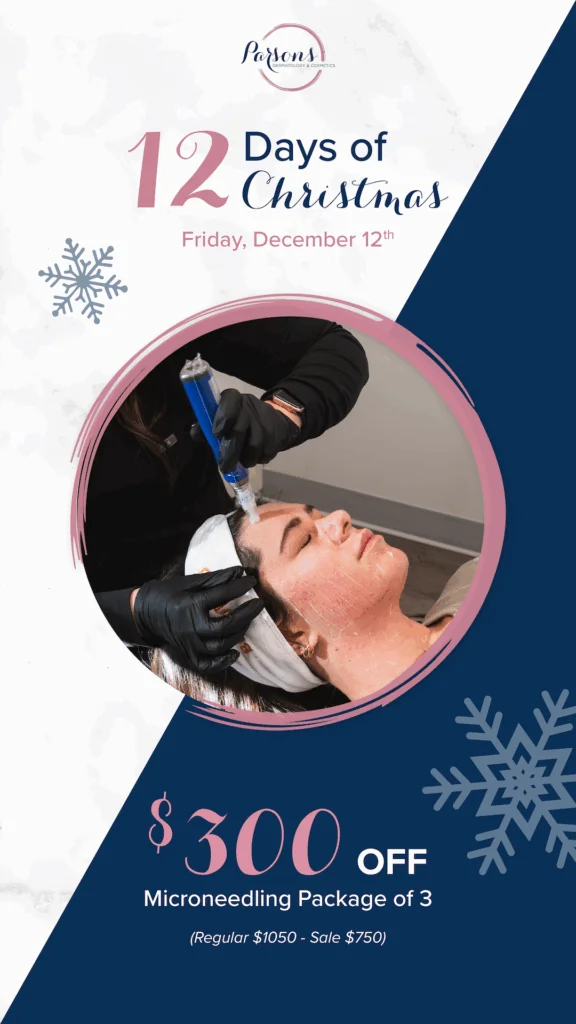 🎄✨It’s the final day of the Parsons Dermatology 12 Days of Christmas Promotions and this promo is one you won’t want to miss! 🎶 On the 12th day of Christmas, Parsons Dermatology gave to me…$300 OFF a package of 3 Microneedling sessions! Regularly $1050 and on SALE now for $750! 🌟 Boost collagen, smooth texture,…