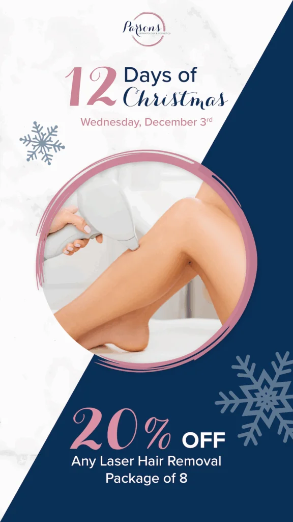 🎶 On the 8th day of Christmas, Parsons Dermatology gave to me… 20% OFF any laser hair removal package of 8 or more. Ditch the razor and enjoy long-lasting results of silky smooth skin with our painless laser hair removal. ✨ Safe, effective, and perfect for all skin tones. 📆 Offer valid until Dec. 5th…