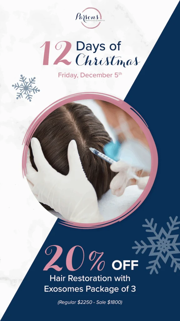 🎶 On the 9th day of Christmas, Parsons Dermatology gave to me… 20% OFF Hair Restoration with Scalp Exosomes Package of 3. Regularly $2250 – Sale $1800. Our advanced Scalp Exosome Hair Restoration treatment helps stimulate new growth and strengthen thinning hair. Get fuller, thicker hair naturally! 💫 📆 Offer valid until Dec. 8th –…