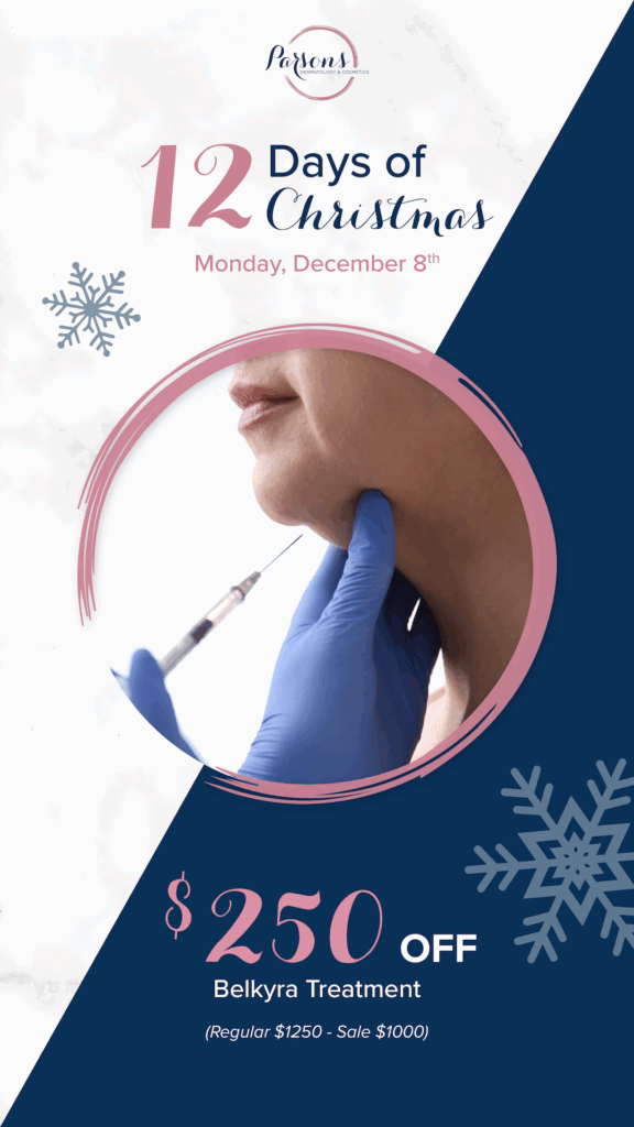 🎶 On the 10th day of Christmas, Parsons Dermatology gave to me…$250 off Belkyra! 🎄 Say goodbye to a double chin and hello to a beautifully sculpted jawline! Belkyra is a non-surgical solution that permanently reduces fat under the chin, giving you a more defined profile. Regularly $1250 on SALE now for $1000 (Savings of…